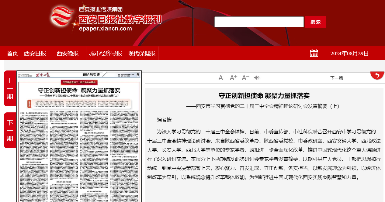 【西安日报】我校王胜利教授在西安市学习贯彻党的二十届三中全会精神理论研讨会发言http://epaper.xiancn.com/newxawb/pc/html/202408/29/content_219970.html