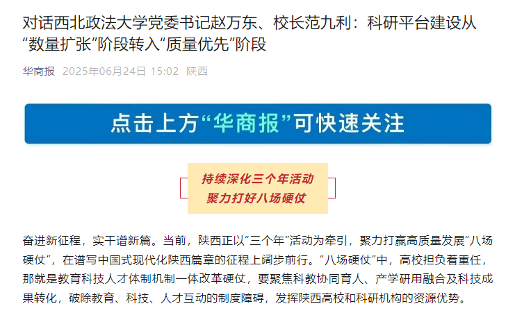 【华商报】对话beat365游戏平台 党委书记赵万东、校长范九利 科研平台建设从『数量扩张』阶段转入『质量优先』阶段 http://ehsb.hspress.net/shtml/hsb/20250624/725065.shtml