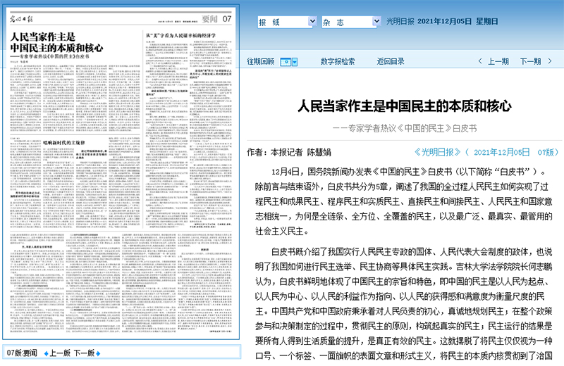 白皮书既介绍了我国实行人民民主专政的国体、人民代表大会制度的政体,也说明了我国如何进行民主选举、民主协商等具体民主实践。吉林大学法学院院长何志鹏认为,白皮书鲜明地体现了中国民主的宗旨和特色,即中国的民主是以人民为起点、以人民为中心、以人民的利益作为指向、以人民的获得感和满意度为衡量尺度的民主。中国共产党和中国政府秉承着对人民负责的初心,真诚地规划民主;在整个政策参与和决策制定的过程中,贯彻民主的原则,构筑起真实的民主;民主运行的结果是要所有人得到生活质量的提升,是真正有效的民主。这就摆脱了将民主仅仅视为一种口号、一个标签、一面旗帜的表面文章和形式主义,将民主的本质内核贯彻到了治国理政的全方位、全成员、全过程。