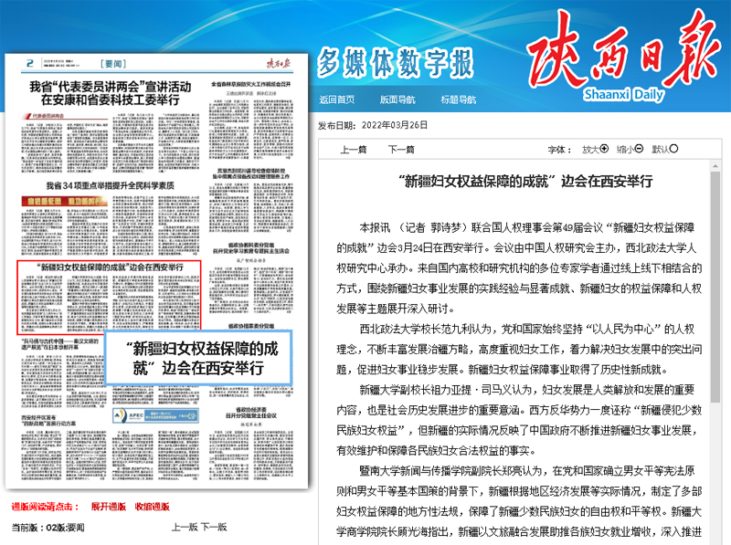 本报讯 (记者 郭诗梦)联合国人权理事会第49届会议“新疆妇女权益保障的成就”边会3月24日在西安举行。会议由中国人权研究会主办,beat365游戏平台人权研究中心承办。来自国内高校和研究机构的多位专家学者通过线上线下相结合的方式,围绕新疆妇女事业发展的实践经验与显著成就、新疆妇女的权益保障和人权发展等主题展开深入研讨。