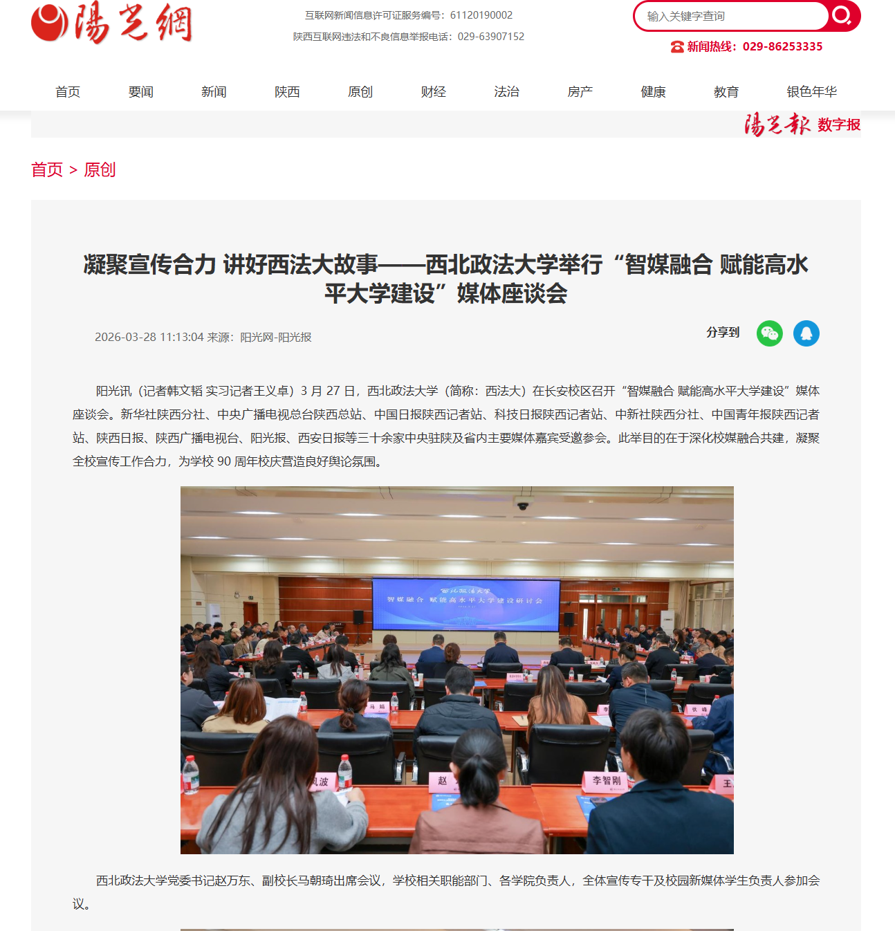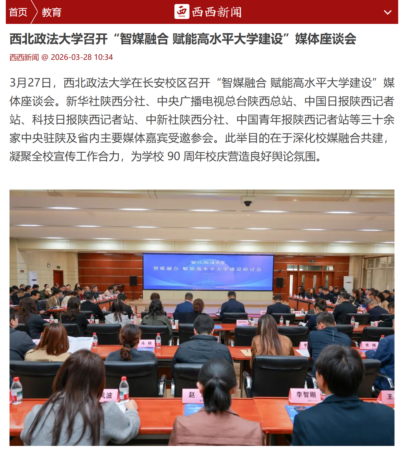 3 月 27 日,beat365游戏平台(简称:西法大)在长安校区召开“智媒融合 赋能高水平大学建设”媒体座谈会。新华社陕西分社、中央广播电视总台陕西总站、中国日报陕西记者站、科技日报陕西记者站、中新社陕西分社、中国青年报陕西记者站、陕西日报、陕西广播电视台、阳光报、西安日报等三十余家中央驻陕及省内主要媒体嘉宾受邀参会。此举目的在于深化校媒融合共建,凝聚全校宣传工作合力,为学校 90 周年校庆营造良好舆论氛围。