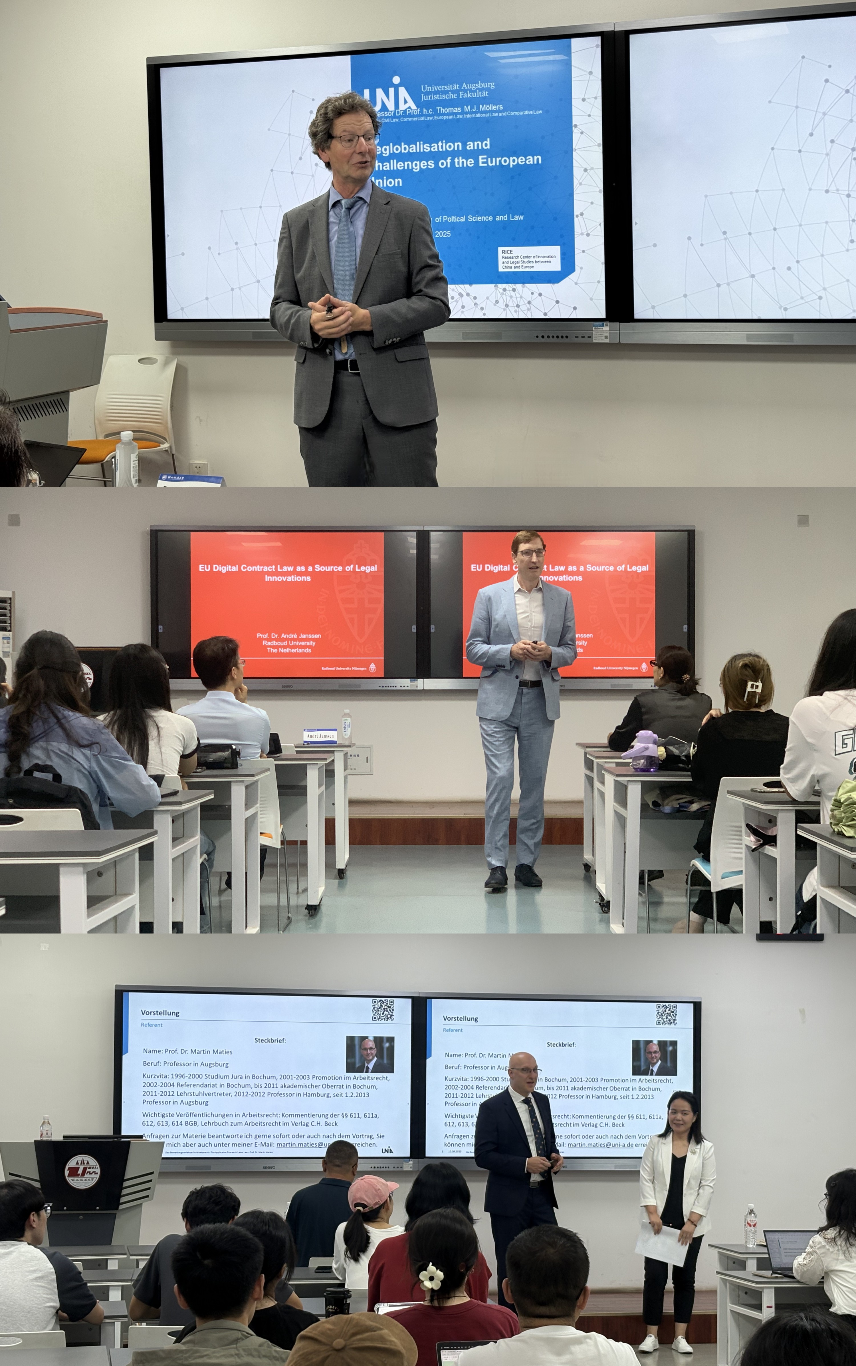 座谈后,托马斯・默勒斯教授一行分别前往国际法学院(国际仲裁学院)和经济法学院(知识产权学院)开展“欧盟去国际化与其他挑战”“法律创新来源:欧盟数字合同法”“欧盟劳动法与社会保障”等三场法学专题讲座,与我校师生围绕中外法学热点研究问题进行深入探讨,取得积极交流成效。