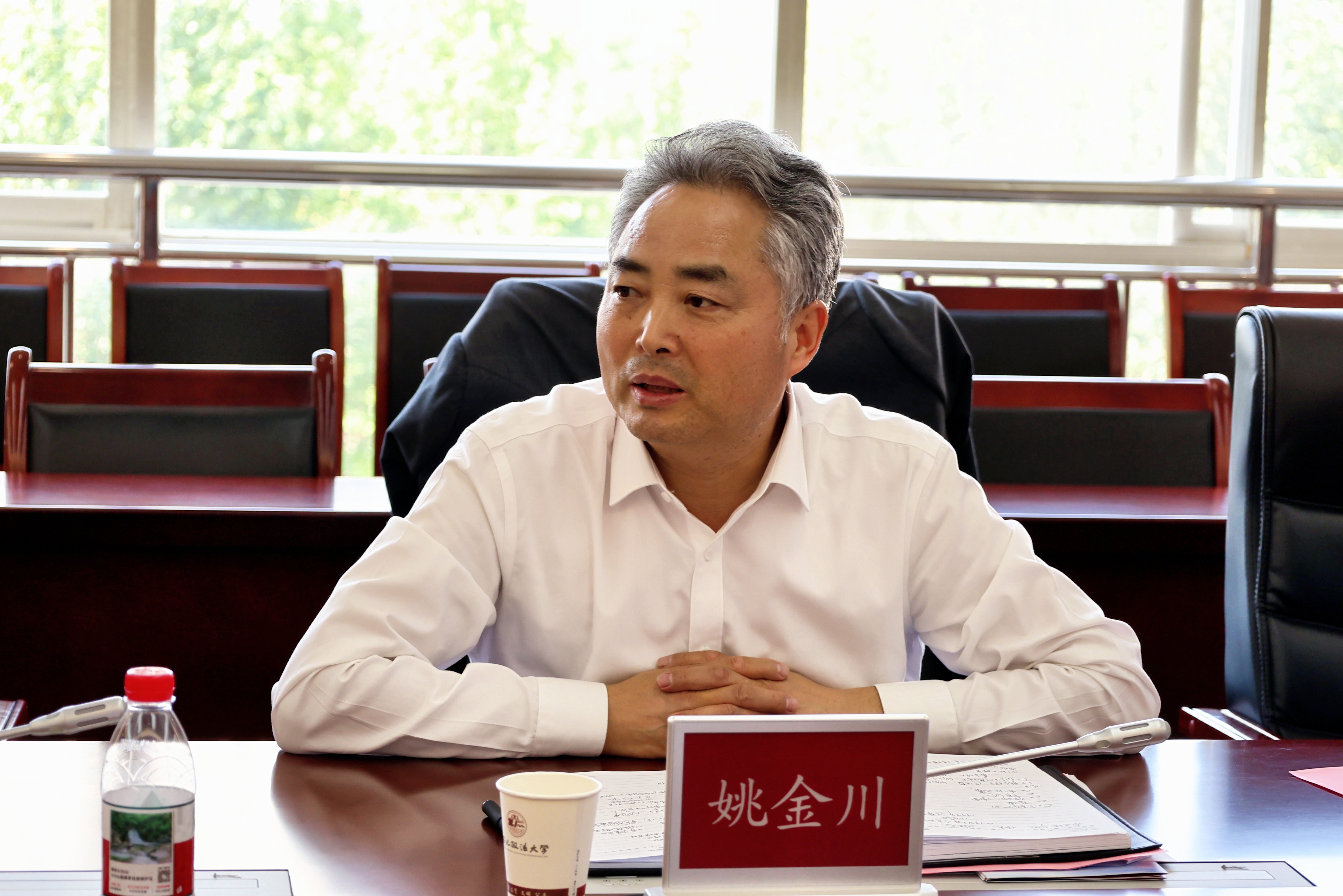 赵万东对姚金川一行表示欢迎,并对学校历史沿革、办学特色、战略发展、人才培养、国际交流和对台工作等方面进行了介绍。他表示,近年来在省委台办的有力指导下,学校对台交流合作稳步推进,形成了稳定的交流网络,并成功打造了以“海峡两岸法律文化周”为代表的一系列交流平台。面对新形势与新挑战,赵万东强调,学校将以此次调研为重要契机,深入贯彻落实中央和省委对台工作部署,聚焦重点难点问题,着力深化与台湾高校及研究机构的务实合作,充分发挥法学学科专业优势,积极探索建立常态化交流机制,致力于产出更多具有价值与影响力的研究成果,为推动两岸关系和平发展贡献坚实的学术智慧与理论支撑。
